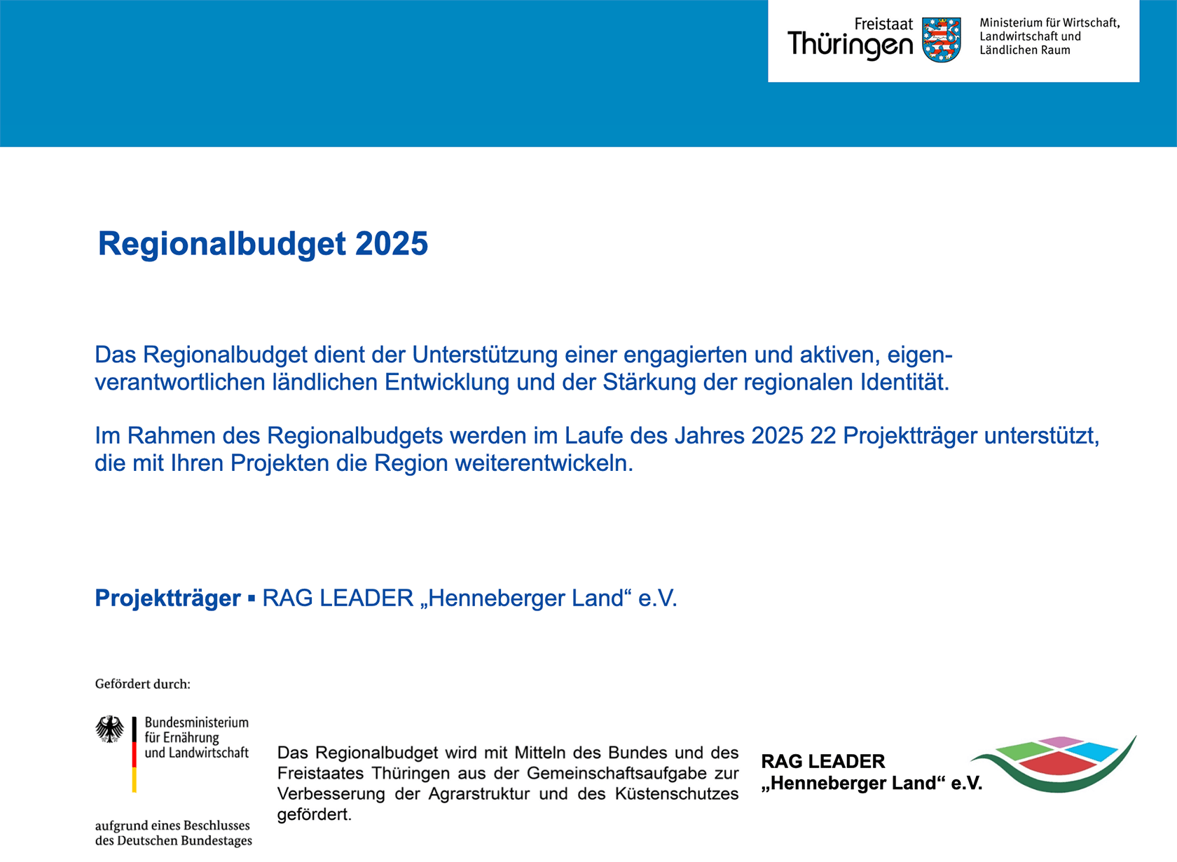 Für die RAG LEADER „Henneberger Land“ e.V. werden 200.000 € für Kleinprojekte im Jahr 2025 zur Verfügung gestellt. Das Regionalbudget wird finanziert aus Mitteln der Gemeinschaftsaufgabe zur Verbesserung der Agrarstruktur und Küstenschutz (GAK).